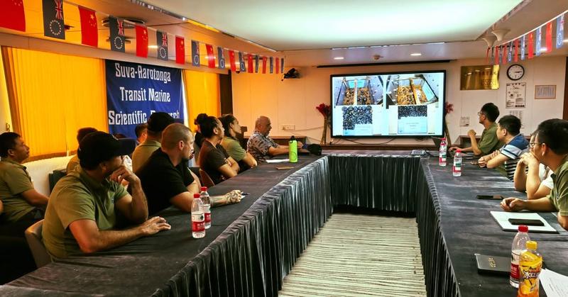 During the “4-day transit from Fiji to the Cook Islands,” the team took part in a range of training drills and educational seminars to familiarise themselves with ship operations and onboard research systems.